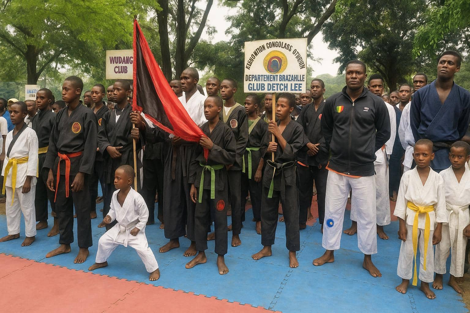 La journée a débuté par un défilé coloré dans les artères de Mfilou, immédiatement suivi d’une opération citoyenne de nettoyage de la grande avenue Maïté-la-Mairie, geste symbolique rappelant que l’esprit d’un art martial se conjugue toujours avec le respect de l’environnement urbain.